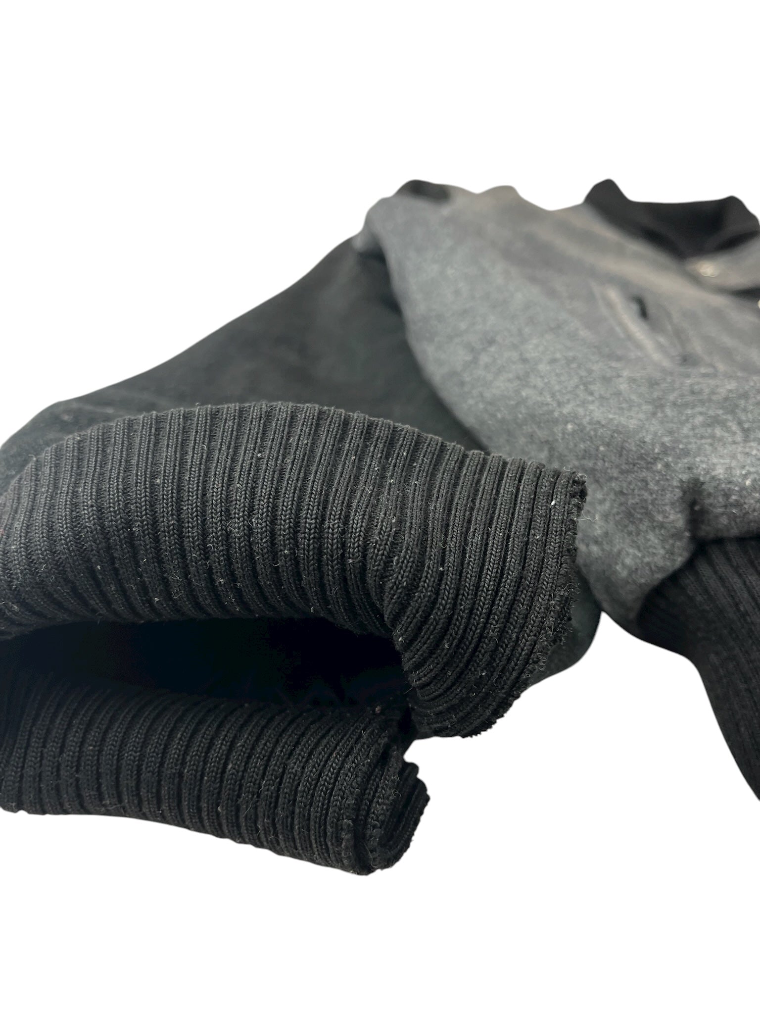 No visible stains. No visible holes. Rip along the right cuff.